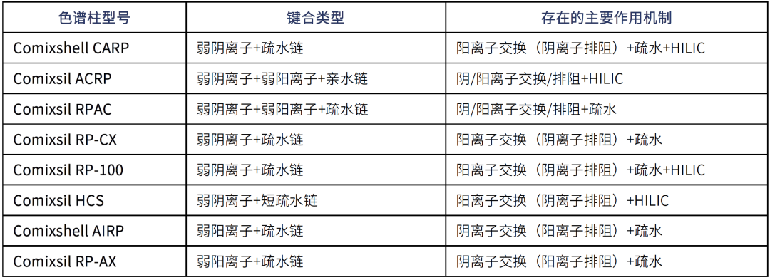 2021年,我們在混合作用(mixed-mode)固定相設計上繼續開疆拓土,開發出了Comixsep系列的三款多種作用力組合的反相固定相;