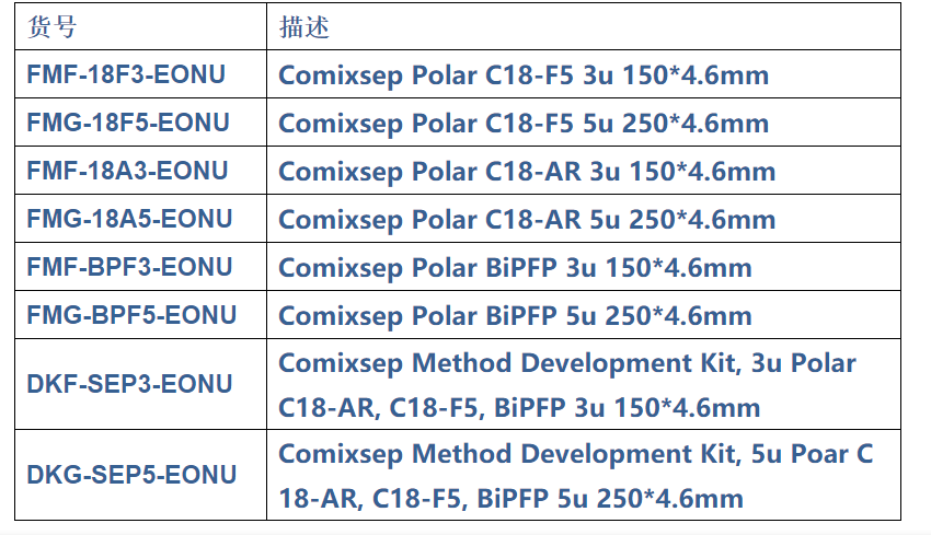它們在疏水作用的基礎上增加了很強的氫鍵、π-π、偶極-偶極等作用,使色譜柱具有了和一切現有常規C18等反相柱不同的選擇性,極大地增加了解決復雜分析問題的成功率。同時,Comixsep系列色譜柱的操作和常規C18一樣,無需特別的沖洗、平衡和保存條件,使用非常友好。