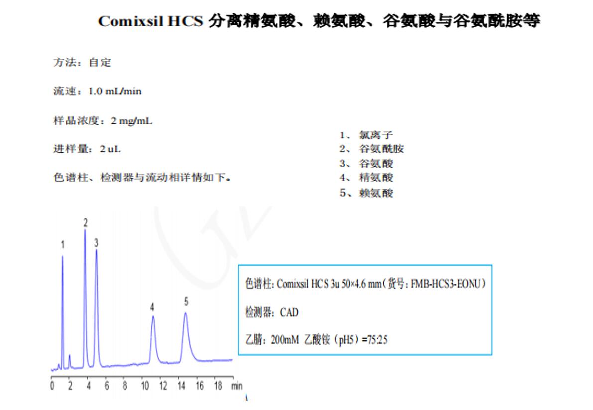 由上面幾個圖可以看到,四個氨基酸他們都有一個氨基的pka在9左右,也就是說ph低于7都有電離,而且他們也都有一個羥基的pka在2左右,所以ph大于4左右也會有電離,所以當使用的緩沖鹽的ph等于5時,可以使用陽離子交換和陰離子排斥的作用,同時也可以使用氫鍵的作用作為保留。再根據他們的親水性不同,將他們分開。