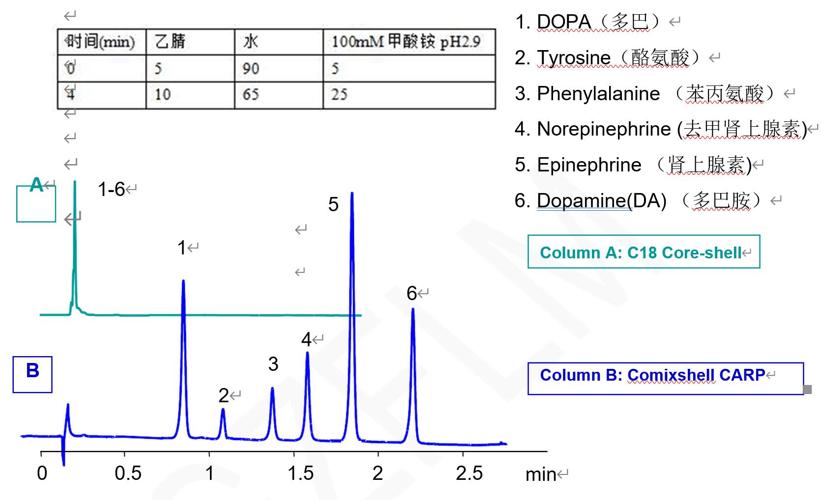 說明:多巴胺等大極性神經遞質在C18上沒有保留難以分離,采用Comixshell陽離子交換