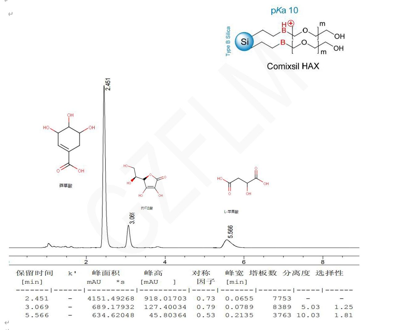 方法說明:使用 Comixsil HAX 是陰離子交換+HILIC 混合模式,對莽草酸、抗壞血酸、蘋果酸三個有機酸進行保留并分離,蘋果酸具有雙羧基結構,保留較強。