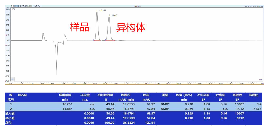 綜上所述,使用菲羅門手性柱對烏帕替尼中間體進(jìn)行手性拆分是一個復(fù)雜但重要的過程。通過選擇合適的色譜柱、配置適當(dāng)?shù)牧鲃酉唷⑦M(jìn)行專業(yè)的操作和數(shù)據(jù)分析,可以確保拆分過程的順利進(jìn)行和拆分后得到的對映體的質(zhì)量。 |