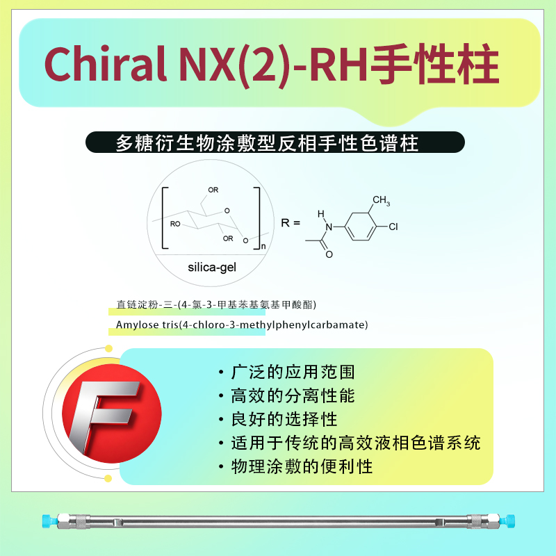 Chiral NX(2)-RH反相手性柱的固定相為直鏈淀粉-三-(4-氯-3-甲基苯基氨基甲酸酯)(Amylose tris(4-chloro-3-methylphenylcarbamate))。這種固定相具有獨(dú)特的光學(xué)活性,能夠?qū)κ中曰衔镞M(jìn)行高效識別和分離。