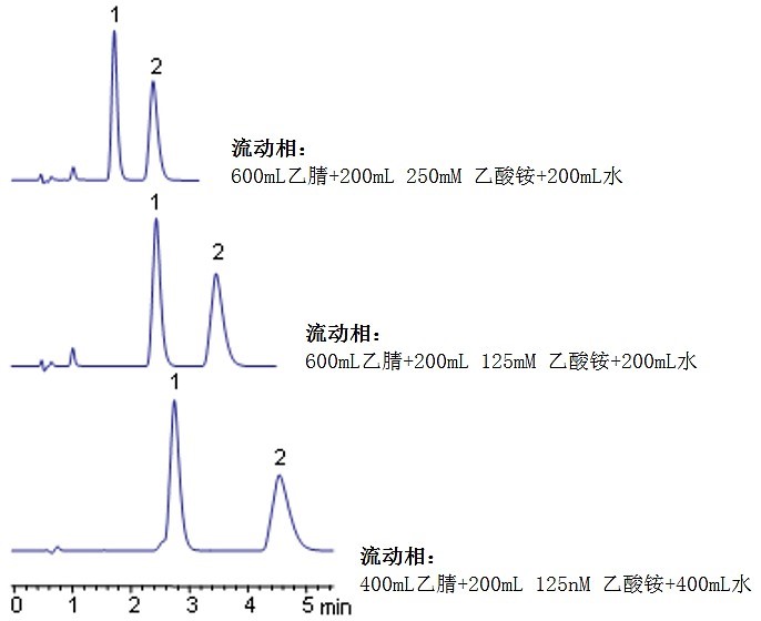 這些化合物的洗脫通過流動相中離子的強度和乙腈的比例來控制。
