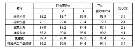表2 2.0 mg/kg豬肉中獸藥多殘留的添加回收率結果