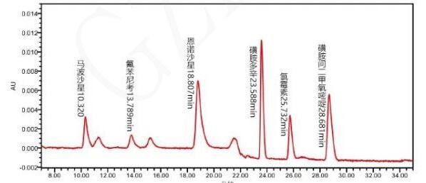 2、2.0 mg/kg豬肉中獸藥多殘留檢測的液相色譜圖