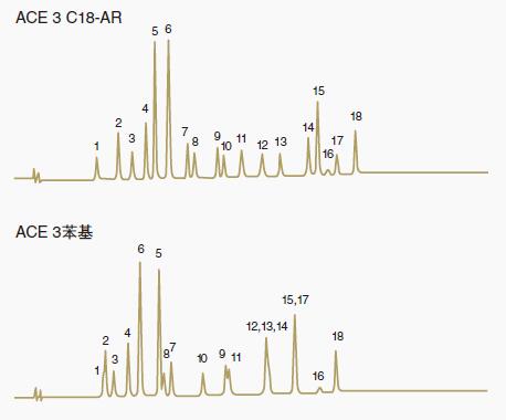C18-AR可能具有其它不同的分離機制,可以為復雜的混合物帶來更好的分離效果。對于其他混合物,可能不是這種情況,這是ACE鍵合相的優勢。