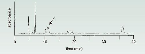 圖11.峰延遲洗脫通常在38.5分鐘時出現(遲洗脫峰(正常情況下在第38.5分鐘出現的洗脫峰)),位于(出現在了)下一個縮短的等度運行的色譜圖的12.0分鐘(箭頭)處。來源[6]。