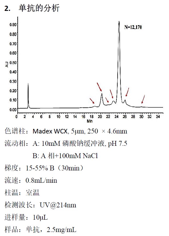 離子交換色譜,是根據(jù)蛋白質(zhì)分子在一定PH值和離子強(qiáng)度條件下所帶電荷的差異進(jìn)行分離的方法。Madex 系列離子交換色譜柱以聚苯乙烯/二乙烯苯(PS/DVB)顆粒為填料,并在其表面鍵合有一層高度親水的納米厚度的中性聚合物薄膜,最后再將離子交換官能團(tuán)致密、均勻地鍵合在親水表面而制成。四種固定相互補(bǔ),其中,WCX 固定相是專為抗體分離而設(shè)計。